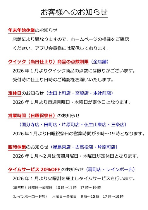 着物の撥水加工「半額」 2025年10月25日 | 店舗会員様へのお知らせ 撥水加工のみ(クリーニングなし) 通常価格 4,400円 → 2,200円(税込) 撥水加工料金(クリーニングあり) 通常価格 3,300円 → 1,650円(税込)